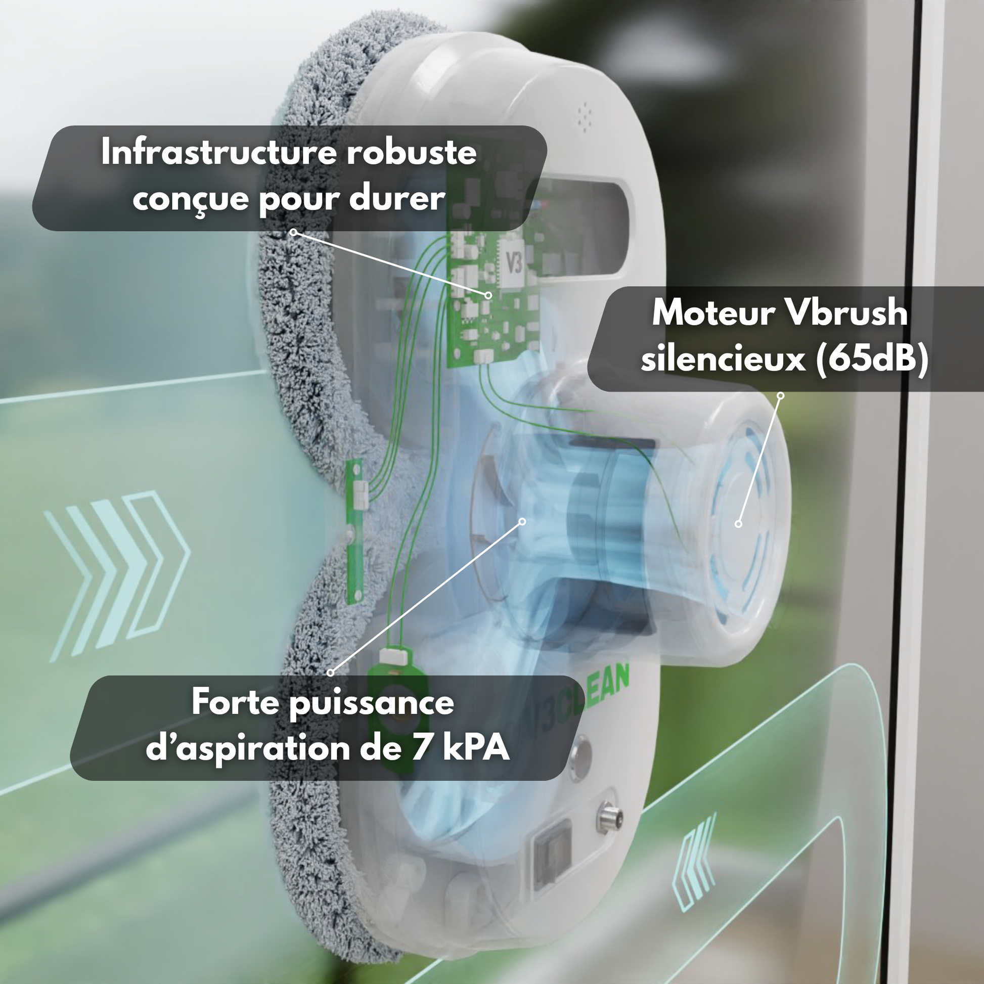 Grâce à un moteur d'aspiration puissant et silencieux, 7kPa - 65dB, le robot lave vitre V3CLEAN® aspire les poussières et allergènes de vos vitres.